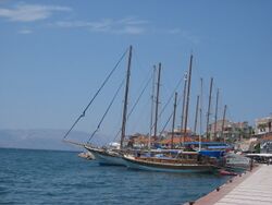The town of Çeşme lies across a strait facing the Greek island of Chios, which is only a few miles' away. There are regular ferry connections between the two locations, as well as larger ferries from and to Italy (Ancona, Bari, and Brindisi), used extensively by Turks living in Germany returning for their summer holidays.