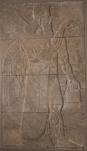 There is a particular interest in the anatomy of both humans and animals within the depictions.[13] Royal hunting scenes are some of the most well known of the Nimrud reliefs particularly those showing Assurnasirpal II hunting lions. There is also a distinct interest in the relationship between man and animal in many of the scenes. In several depictions the king is shown with supernatural creatures of animal and human combination. All of the apotropaic portrayals, which would have decorated the doorways of the palace, were of these human and animal hybrids. Within the context of these apotropaic figures were three main types, a winged figure wearing the horned crown which symbolized divinity, a winged figure wearing a headband of rosettes and a winged human figure with the head of a bird.[12]