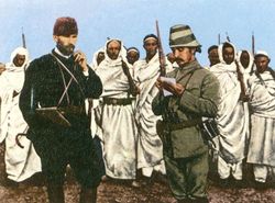 عاد أتاتورك لاحقاً للشام وتكرر الأمر مثبتاً الواقع لديه لكن الموقف الثاني كان كارثياً، مع الغزو الإيطالي لليبيا 1911 تطوع عدد من الضباط الأتراك (للجهاد) هناك إعتبارها جزء من الخلافة، حين ذهب أتاتورك لليبيا كان غاضباً ففي رأيه ليبيا لا قيمة لها وبعيدة بينما الخطر الحقيقي على الأرض العثمانية الغالية باوروپا المهددة ومنها سالونيك نفسها، عندما ذهب لم يجد وسيلة مواصلات لليبيا بحرياً لعدم وجود أسطول عثماني حقيقي واقتصاره على طراد واحد فقط يسمى الحميدية، عبر الطريق البري مر بمصر وفوجئ بأن إنگلترا تعلن مصر محايدة فتضاعف الغضب فبلد من الخلافة يعلن نفسه محايد ويمنع مرور ضباط الخلافة لبلد آخر تابع للخلافة محتل، وصل إلى ليبيا بمعجزة ليفاجأ بواقع مزري فليبيا مشتتة القوة بين قبائل تتربح من الحرب وترتزق منها لا تحب الأتراك ولا تعرف شيء عن العسكرة، وجد ليبيا محل عرض أكثر من كونها محل صدام ومع هذا أدى دوره بكفاءة بالذات في معركة درنة التي قادها وانتصر بها ومعركة طبرق حيث أصيب ليعرف لاحقاً بالخبر الكارثي بإعلان تحالف البلقان الحرب والسيطرة على كامل ممتلكات الدولة العثمانية باوروپا وعلى رأسها سالونيك، كانت ليبيا ثاني محل للتشابك العربي مع أتاتورك وكانت بشعة ممتلئة بالمتاعب منعدمة الفائدة والمظهر القبائلي الفاسد مالياً والضياع العسكري فلم تكن مصر وليبيا أفضل من الشام لديه وتسببت ليبيا في رأيه في ضياع الأراضي الاوروپية الهامة للعثمانيين.