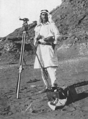 أحمد حسنين أثناء رحلته في عام 1923 في الصحراء الليبية، التي حصل منها على الكثيرات من البيانات العلمية. لاحظ ساعة معصمه التي استخدمها في معرفة الإحداثيات.