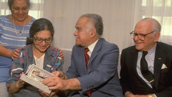 رئيس وزراء إسرائيل، إسحاق شامير مع سجينة صهيون السابقة، إيدا نودل، وإلى يمين الصورة: أرماند هامر في مكتب رئيس الوزراء في القدس.