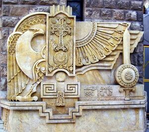 In 1915, the Syrian region of Deir ez-Zor, mainly a desert became a final destination of the Armenians during Armenian genocide where they were killed. A memorial complex commemorating this tragedy was opened in the city.[38] It was designed by Sarkis Balmanoukian and was officially inaugurated in 1990 with the presence of the Armenian Catholicos of the Great House of Cilicia. The complex contains bones and remnants recovered from the Deir ez-Zor desert of Armenian victims of the Genocide and has become a pilgrim destination for many Armenians in remembrance of their dead.