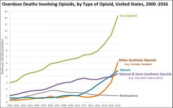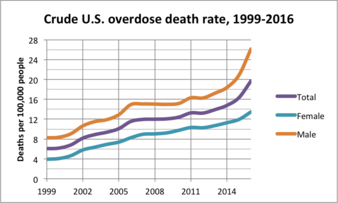 صافي معدل وفيات الجرعة الزائدة في الولايات المتحدة، 1999–2016. البيانات من تقارير الإصابات القاتلة WISQARS الصادر عن مركز مكافحة والوقاية من الأمراض..[3]