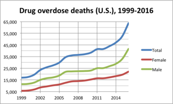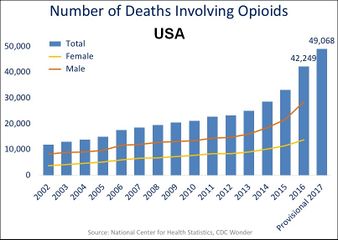 الأرقام المبكرة للوفيات جراء الجرعة الزائدة من المواد الأفيونية في الولايات المتحدة من جميع العقاقير الأفيونية. عام 2017، توفى 72.000 شخص بالجرعة الزائدة في الولايات المتحدة.[2]