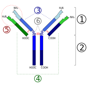 - Heavy chain (أزرق) مع واحدة متغيرة (VH) نطاق متبوع بثابتة (CH1), منطقة المفصل, و اتنين اخريين ثابتتين (CH2 and CH3) نطاقات