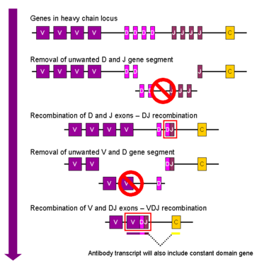 النطاق الكروموسومي الذي يشفر الجسم المضاد كبير ويحتوي على العديد من مواقع الجينات المميزة لكل نطاق من الأجسام المضادة - تم العثور على منطقة الكروموسوم التي تحتوي على جينات السلسلة الثقيلة ( IGH @ ) على الكروموسوم 14 ، والمكان الذي يحتوي على جينات سلسلة لامدا وكابا الخفيفة ( IGL @ و IGK @ ) في الكروموسومات 22 و 2 في البشر. يسمى أحد هذه النطاقات النطاق المتغير ، الموجود في كل سلسلة ثقيلة وخفيفة من كل جسم مضاد ، ولكن يمكن أن يختلف في الأجسام المضادة المختلفة المتولدة من الخلايا البائية المميزة. توجد الاختلافات بين النطاقات المتغيرة في ثلاث حلقات تعرف باسم المناطق شديدة التغير (HV-1 و HV-2 و HV-3) أو مناطق تحديد التكامل (CDR1 و CDR2 و CDR3). يتم دعم CDRs داخل النطاقات المتغيرة من خلال مناطق الإطار المحفوظة. يحتوي موضع السلسلة الثقيلة على حوالي 65 جينًا مختلفًا في مجال متغير تختلف جميعها في CDRs الخاص بها. يؤدي دمج هذه الجينات مع مجموعة من الجينات في نطاقات أخرى من الأجسام المضادة إلى توليد سلاح فرسان كبير من الأجسام المضادة بدرجة عالية من التباين. تسمى هذه التركيبة إعادة التركيب V (D) J الموضحة أدناه.[57]