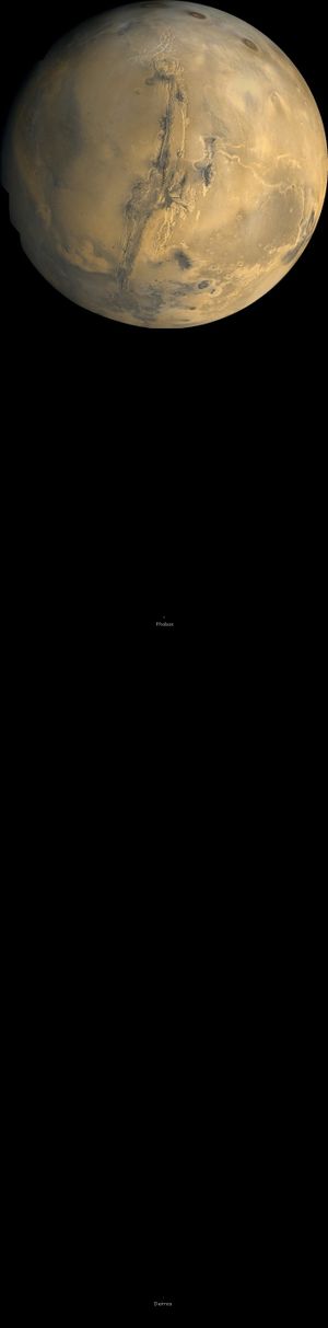 The relative sizes of and distance between Mars, Phobos, and Deimos, to scale