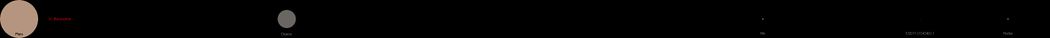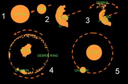 1.تكون أقمار پلوتو: a Kuiper Belt Object nears Pluto; 2.الKBO يصدم پلوتو; 3: a dust ring forms around Pluto; 4: the debris aggregates to form Charon; 5: Pluto and Charon relax into spherical bodies.