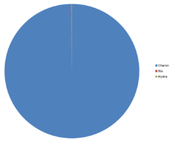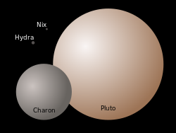 الأحجام النسبية لأقمار پلوتو. شارون يسيطر على النظام، نيكس وهيدرا بالكاد يظهرون بهذا المقياس.