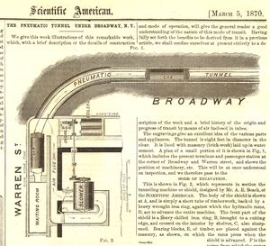Beach's most famous invention was New York City's first subway, the Beach Pneumatic Transit.[3] This idea came about during the late 1860s, when traffic in New York was a nightmare, especially along the central artery, Broadway. Beach was one of a few visionaries who proposed building an underground railway under Broadway to help relieve the traffic congestion. The inspiration was the underground Metropolitan Railway in London but in contrast to that and others' proposals for New York, Beach proposed the use of trains propelled by pneumatics instead of conventional steam engines, and construction using a tunnelling shield of his invention[4] to minimize disturbing the street.[5]