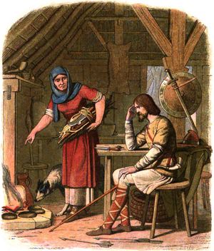 Alfred the Great is scolded by his subject, a neatherd's wife, for not turning the breads but readily eating them when they are baked in her cottage.