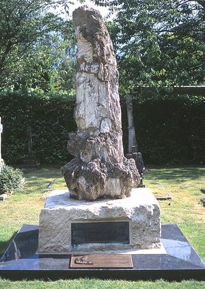 Wallace's grave in Broadstone Cemetery, Broadstone, Dorset, which was restored by the A. R. Wallace Memorial Fund in 2000. It features a 7-قدم (2.1 m) tall fossil tree trunk from Portland mounted on a block of Purbeck limestone.