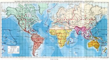 خريطة العالم من التوزيع الجغرافي للحيوانات توضح المناطق الجغرافاي الطبيعية الستة لوالاس.