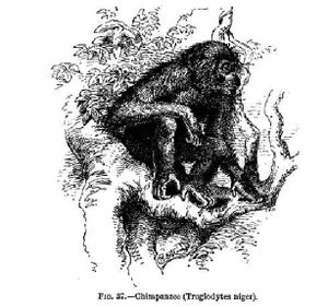 رسم من فضل عن طبيق الانتخاب الطبيعي على البشر في كتاب والاس لعام 1889 الدارونية يوضح الشيمپانزي.