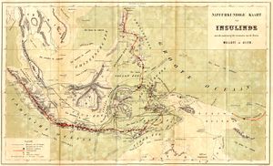 A map from The Malay Archipelago shows the physical geography of the archipelago and Wallace's travels around the area. The thin black lines indicate where Wallace travelled, and the red lines indicate chains of volcanoes.