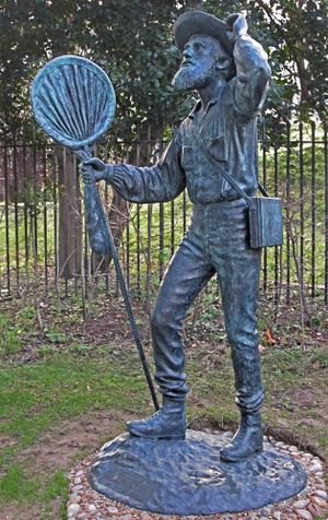 تمثال بالبرونز لعالم الطبيعي ألفرد رسل والاس (1823-1913)، أنطوني سميث. He is looking up at a bronze model of a Wallace's golden birdwing butterfly (Ornithoptera croesus). The statue was commissioned by the Wallace Memorial Fund and was given to the Natural History Museum, London, where it was unveiled by Sir David Attenborough on November 7th 2013 - the 100th anniversary of Wallace's death.