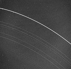 الحلقات الداخلية لاورانوس. الحلقة الخارجية اللامعة هي الحلقة ε، يوجد كذلك ثمان حلقات أخرى.