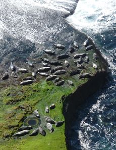 Orkney has an abundance of wildlife, especially of grey and common seals and seabirds such as puffins, kittiwakes, tysties, ravens, and bonxies. Whales, dolphins, and otters are also seen around the coasts. Inland the Orkney vole, a distinct subspecies of the common vole, is an endemic.[24][25] There are five distinct varieties, found on the islands of Sanday, Westray, Rousay, South Ronaldsay, and the Mainland, all the more remarkable as the species is absent on mainland Britain.[26]