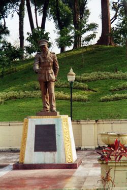 The leaders of the Patriotic Burmese Forces, while disbanded, were offered positions in the Burma Army under British command according to the Kandy conference agreement with Lord Louis Mountbatten in Ceylon in September 1945. Aung San was not invited to negotiate, since the British Governor General, Sir Reginald Dorman-Smith, was debating whether he should be put on trial for his role in the public execution of a Muslim headman in Thaton during the war.[2] The delegates agreed that the new Burmese army would be composed of 5,000 of Aung San's Japanese-trained Bamar soldiers, and 5,000 British-trained soldiers, most of whom were either Chin, Kachin, or Karen.[3] Aung San wrote to U Seinda in Arakan, saying that he supported U Seida's guerrilla fight against the British, but that he would cooperate with them for tactical reasons. After the Kandy Conference, he reorganized his formally disbanded soldiers as a paramilitary organization the People's Volunteer Organization (PVO), which continued to wear uniforms and drill in public. The PVO was personally loyal to Aung San and his party rather than the government. By 1947, the PVO had over 100,000 members.[4] In January 1946 a victory festival was held in the Kachin capital of Myitkyina. Governor Dorman-Smith was invited to attend, but neither Aung San nor anyone from his party were, due to "their connection with the Burma Independence Army".[5]