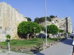The single curving wall that constitutes the surviving land castle closes the tip of a small peninsula and is surrounded by the old town.[10] The now missing seaward wall, which once followed the shore to enclose the entire ward, was visible in the late 19th century.[17] Three round towers and a polygonal bastion survive as well as several casemates with loopholes (shooting ports) and at least seven embrasured windows. The basic plan of the fortress may have been laid in late antiquity, but extensive rebuilding belongs to the early period of Ottoman occupation, when it served as a minor port for the fleet of Suleiman the Magnificent.