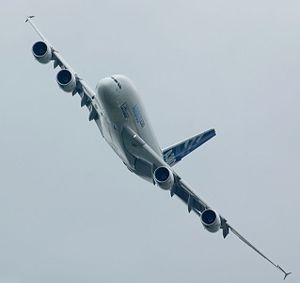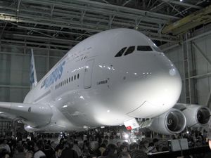ايرباص ايه 380 Airbus A380 هي طائرة ركاب بطابقين ذات جسم عريض تعمل بأربع محركات، من انتاج شركة ايرباص الاوروبية، التي هي احدى الشركات الفرعية لشركة إيدز. وكأكبر طائرة ركاب في العالم، فقد قامت بأول رحلة جوية من تولوز في فرنسا في 27 أبريل من سنة 2005[1]، وقامت بأول رحلة تجارية في 25 اكتوبر 2007 من سنغافورة إلى سيدني مع الخطوط الجوية لسنغافورة. الطائرة كانت تعرف باسم Airbus A3XX أثناء معظم طور تطويرها, ولكن الكنية سوپر جمبو Superjumbo التصقت بها منذ ذلك الحين.
