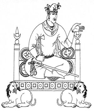 The Ikhshids issues mostly copper coins on the Chinese model (Kaiyuan Tongbao type, round with a central square hole), with legends in Aramaic and Sogdian giving the name and title of the ruler.[31] The Aramaic legend uses the title MLKA "King", the Sogdian legend uses the title xšēδ (Ikhshid, "Ruler").[31] The Ikhshids also issued a few silver coin on the Sasanian model, with face of the ruler on the obverse, and fire altar on the reverse.[22][32] The Hunnic Y-shaped tamgha of the Hephthalites (