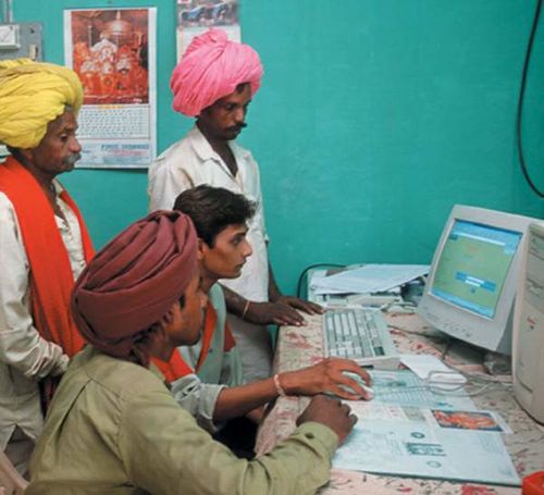 إن المشروع گياندوت Gyandoot (أي: مورِّد المعرفة) في الهند هو مثال على برنامج قائم على مقاربة معلوماتية الجماعة. ففي العام 2000 وفي جنوب غرب ولاية «مادهيا براديش»، التي تعد واحدة من أكثر الولايات الهندية فقرا، قامت الحكومة بهذا المجهود الرقمي لتمنح سلطة اقتصادية وسياسية أوسع لسكان الريف هناك الذين ثلثاهم تقريبا أميون وناقصو التغذية. فقد تسلمت كل قرية كشكا حاسوبيا على اتصال بالأكشاك الأخرى من خلال شبكة حاسوبية. وقام متعهدون محليون بخدمة الأجهزة الحاسوبية، كما قام فريق صغير مكلف من الحكومة بوضع مواد ثقافية على إنترانت گياندوت، وهذه المواد مبنية على تحليل لاحتياجات الناس الاجتماعية والاقتصادية.