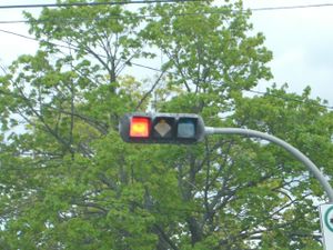 A traffic signal in Halifax, Nova Scotia, كندا with specially-shaped lights to assist people with color blindness.