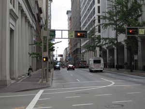 Example of traffic signals mounted on gantries in downtown Cincinnati, Ohio, الولايات المتحدة and integrated with street signage.