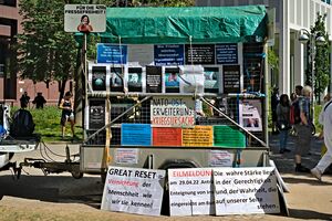 Placards protesting about COVID-19 responses and the "Great Reset", in Frankfurt, Germany, in 2022