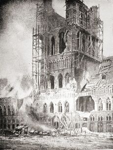 After the war, Winston Churchill proposed to leave Ypres as a mausoleum, with the rightful owners to be deprived from regaining their land. By early March 1919, the Belgian scheme was to leave the Cathedral and Cloth Hall and the buildings around them in ruins.[15] By November 1919, the Belgian government was seriously considering two schemes, both of which would have kept the Cloth Hall and the Cathedral in ruins, but one scheme would allow rebuilding houses around the Grand Place, whereas the other would have created a belt of trees surrounding the Hall and Cathedral.[16] By early September 1920, the decision had been made by the British Government that the Menin Gate and its immediate surroundings would be used as a memorial,[17] by which time, the Belgians had already begun to rebuild the area.[18]