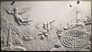 Icarus's father Daedalus, a very talented Athenian craftsman, built a labyrinth for King Minos of Crete near his palace at Knossos to imprison the Minotaur, a half-man, half-bull monster born of his wife and the Cretan bull. Minos imprisoned Daedalus himself in the labyrinth because he gave Minos's daughter, Ariadne, a clew[5] (or ball of string) in order to help Theseus escape the labyrinth and defeat the Minotaur.