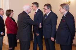 At the end of the 114th Congress in late 2016, Klobuchar had passed more legislation than any other senator.[49] In February 2017 she called for an independent, bipartisan commission to investigate ties between Russia and President Donald Trump and his administration. Concern about Trump's ties to Russia increased after reports that his campaign officials had repeated contact with senior Russian intelligence officials before the 2016 United States elections.[50][51] Klobuchar had already signaled her interest in U.S.–Russia relations in December 2016 when she joined Republican senators John McCain and Lindsey Graham on a trip to the Baltic states and Ukraine.[52] She maintained high approval ratings throughout 2017, with an April 2017 Star Tribune poll placing her approval rating at 72%.[53] In October 2017 Morning Consult listed Klobuchar among the 10 senators with the highest approval ratings, and a November 2017 KSTP-TV poll put her approval rating at 56%.[54][55] An April 2019 Morning Consult poll found Klobuchar to be the third-most popular sitting senator, with a 58% approval rating and 26% disapproval rating, behind only Vermont senators Bernie Sanders and Patrick Leahy.[56]