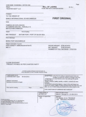 موقع ألفانيوز لايف القبرصي نقل عن مانوليس قوله إن نترات الأمونيوم تم تحميلها على متن سفينة إما في جورجيا أو في أوكرانيا لشحنها إلى الموزمبيق بناءً على طلب حكومة ذلك البلد.
