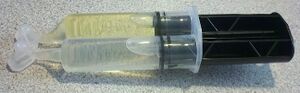 محقنة من غراء الإپوكسي "الذي يجف في 5 دقائق"، تحتوي على حجرات منفصلة لراتنج الإپوكسي والمقسي.