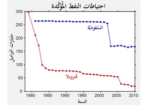 مقارنة بين الاحتياطي النفطي في السعودية (الأزرق) وفنزويلا (الأحمر)