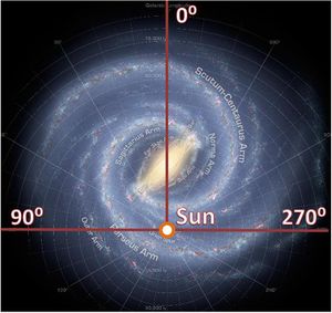 ويبدأ خط الطول المجري من مركزها = 17ساعة 42.4 دقيقة و = -28.92° ويكون مستوي المجرة مائلا نحو 62,6° من خط الاستواء المجري.
