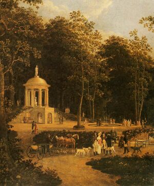 Die Napoleonshöhe im Steiger bei Erfurt, painted by Nikolaus Dornheim (de) in 1812. Inaugurated in March 1811 to celebrate Napoleon's birthday, this Greek-style temple with grotto, flowerbeds and fountain in the Stiegerwald was burned in November 1813 and completely destroyed by Erfurters and their besiegers in 1814.