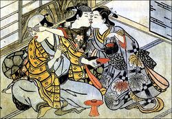 Shudo (Japanese pederasty): a young male entertains an older male lover, covering his eyes while surreptitiously kissing a female servant.