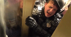 Crowd outside the Capitol during the attack (top); bear spray deployed against a line of policemen (bottom left); attackers breach a police line (bottom right)