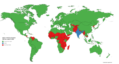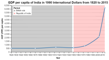 economy of India has transitioned from a mixed planned economy to a mixed middle-income developing social market economy with notable public sector in strategic sectors.[52] It is the world's fifth-largest economy by nominal GDP and the third-largest by purchasing power parity (PPP). According to the International Monetary Fund (IMF), on a per capita income basis, India ranked 139th by GDP (nominal) and 127th by GDP (PPP).[53] From independence in 1947 until 1991, successive governments followed Soviet model and promoted protectionist economic policies, with extensive Sovietization, state intervention, demand-side economics, natural resources, bureaucrat driven enterprises and economic regulation. This is characterised as dirigism, in the form of the Licence Raj.[54][55] The end of the Cold War and an acute balance of payments crisis in 1991 led to the adoption of a broad economic liberalisation in India and indicative planning.[56][57] Since the start of the 21st century, annual average GDP growth has been 6% to 7%.[52] The economy of the Indian subcontinent was the largest in the world for most of recorded history up until the onset of colonialism in early 19th century.[58][59][60] India accounts for 7.2% of the global economy in 2022 in PPP terms, and around 3.4% in nominal terms in 2022.[61][62]