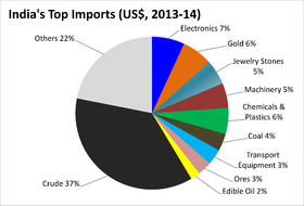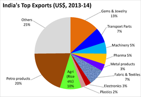 اقتصاد الهند، هو عاشر أكبر اقتصاد في العالم حسب ن.م.إ. الاسمي وثالث أكبر اقتصاد في العالم حسب القدرة الشرائية المتعادلة (ق.ش.م.).[40] الهند هي عضم في مجموعة العشرين، والبريك، واقتصاد متطور ضمن أكبر 20 اقتصاد تجاري عالمي حسب منظمة التجارة الدولية.[41] كانت الهند في البلد التجاري رقم 19 وسادس أكبر مصدر خدمات في العالم في 2013؛ كان إجمالي صادرتها 616.7 بليون في التجرة والخدمات، والبلد التجاري رقم 12 وسابع أكثر مورد خدمات في العالم.[42] تباطئ نمو الاقتصاد الهندي إلى 4.7% في السنة المالية 2013-14، على النقيض من معدلات النمو المرتفعة في عقد 2000.[43] حسب صندوق النقد الدولي، سينمو الناتج المحلي الإجمالي للهند إلى أكثر من 5.4% في 2014-15.[44] يمثل القطاع الزراعي أكبر مُشغل في الاقتصاد الهندي لكنه يساهم بحصة ضئيلة في ن.م.إ. (13.7% في 2012-13).[45] ويشارك القطاع الصناعي بنصيب ثابت في الاقتصاد الهندي، بينما تمثل الخدمات القطاع الأسرع نمواً - والذي يشمل الانشاءات، الاتصالات، البرمجيات وتكنولوجيا المعلومات، البنية التحتية، السياحة، التعليم، الرعاية الصحية، السفر، التجارة، الصرافة ومكونات أخرى.[46]