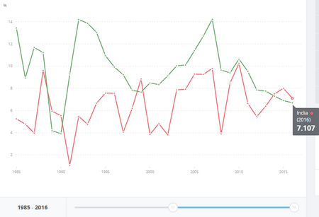 India started recovery in 2013–14 when the GDP growth rate accelerated to 6.4% from the previous year's 5.5%. The acceleration continued through 2014–15 and 2015–16 with growth rates of 7.5% and 8.0% respectively. For the first time since 1990, India grew faster than China which registered 6.9% growth in 2015.[needs update] However the growth rate subsequently decelerated, to 7.1% and 6.6% in 2016–17 and 2017–18 respectively,[171] partly because of the disruptive effects of 2016 Indian banknote demonetisation and the Goods and Services Tax (India).[172]