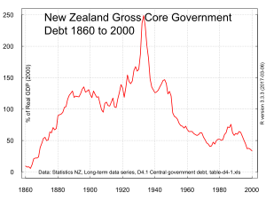 New Zealand has also had persistent current-account deficits since the early 1970s, peaking at −7.8% of GDP in 2006 but falling to −2.6% of GDP in FY 2014.[100] The CIA World Fact Book estimates New Zealand's 2017 public debt (that owed by the government) at 31.7% of GDP.[101] Between 1984 and 2006, net external foreign debt increased 11-fold, to NZ$182 billion.[35] اعتبارا من المعلمة المطلوبة غير صحيحة 1=الشهر! 2018[تحديث][[تصنيف:مقالات فيها عبارات متقادمة منذ المعلمة المطلوبة غير صحيحة 1=الشهر! 2018]] gross core crown debt was NZ$84,524 million or 29.5% of GDP and net core crown debt was NZ$62,114 million or 21.7% of GDP.[17]