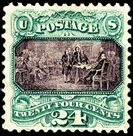 لجنة الخمسة (أدمز، شرمان، لڤنگستون، وفرانكلين)، جفرسون، يقدمون مسودة إعلان الاستقلال إلى الكونگرس القاري الثاني في فيلادلفيا في 28 يونيو 1776، كما هو موضح في پورتريه جون ترمبل 1819. | |