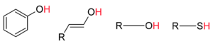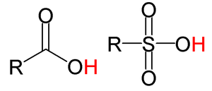 The general structure of a few strong organic acids. From left to right: carboxylic acid, sulfonic acid. The acidic hydrogen in each molecule is colored red.