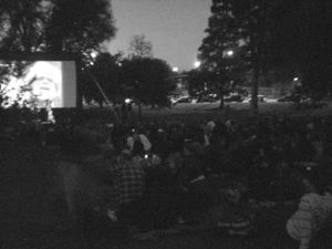 A crowd gathers for the Moonlight Cinema in the Treasury Gardens, which was showing a documentary film about a reformed Aboriginal Australian convict.