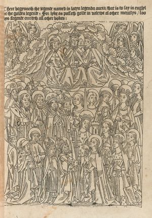 [[wikisource:Catholic Encyclopedia (1913)/Legends of the Saints "|Legends of the Saints]"]. Catholic Encyclopedia. New York: Robert Appleton Company. 1913. {{cite encyclopedia}}: Check|url=value (help)- Illustrations of The Golden Legend from the HM 3027 manuscript of Legenda Aurea from the Huntington Library