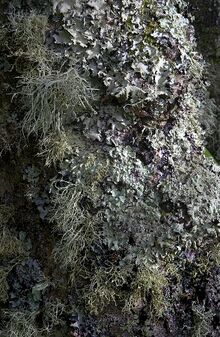 Different colored lichens may inhabit different adjacent sections of a rock face, depending on the angle of exposure to light.[41] Colonies of lichens may be spectacular in appearance, dominating much of the surface of the visual landscape in forests and natural places, such as the vertical "paint" covering the vast rock faces of Yosemite National Park.[42]