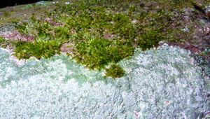 Formerly, some lichen taxonomists placed lichens in their own division, the Mycophycophyta, but this practice is no longer accepted because the components belong to separate lineages. Neither the ascolichens nor the basidiolichens form monophyletic lineages in their respective fungal phyla, but they do form several major solely or primarily lichen-forming groups within each phylum.[87] Even more unusual than basidiolichens is the fungus Geosiphon pyriforme, a member of the Glomeromycota that is unique in that it encloses a cyanobacterial symbiont inside its cells. Geosiphon is not usually considered to be a lichen, and its peculiar symbiosis was not recognized for many years. The genus is more closely allied to endomycorrhizal genera. Fungi from Verrucariales also form marine lichens with the brown algae Petroderma maculiforme,[88] and have a symbiotic relationship with seaweed (such as rockweed) and Blidingia minima, where the algae are the dominant components. The fungi is thought to help the rockweeds to resist desiccation when exposed to air.[89][90] In addition, lichens can also use yellow-green algae (Heterococcus) as their symbiotic partner.[91]